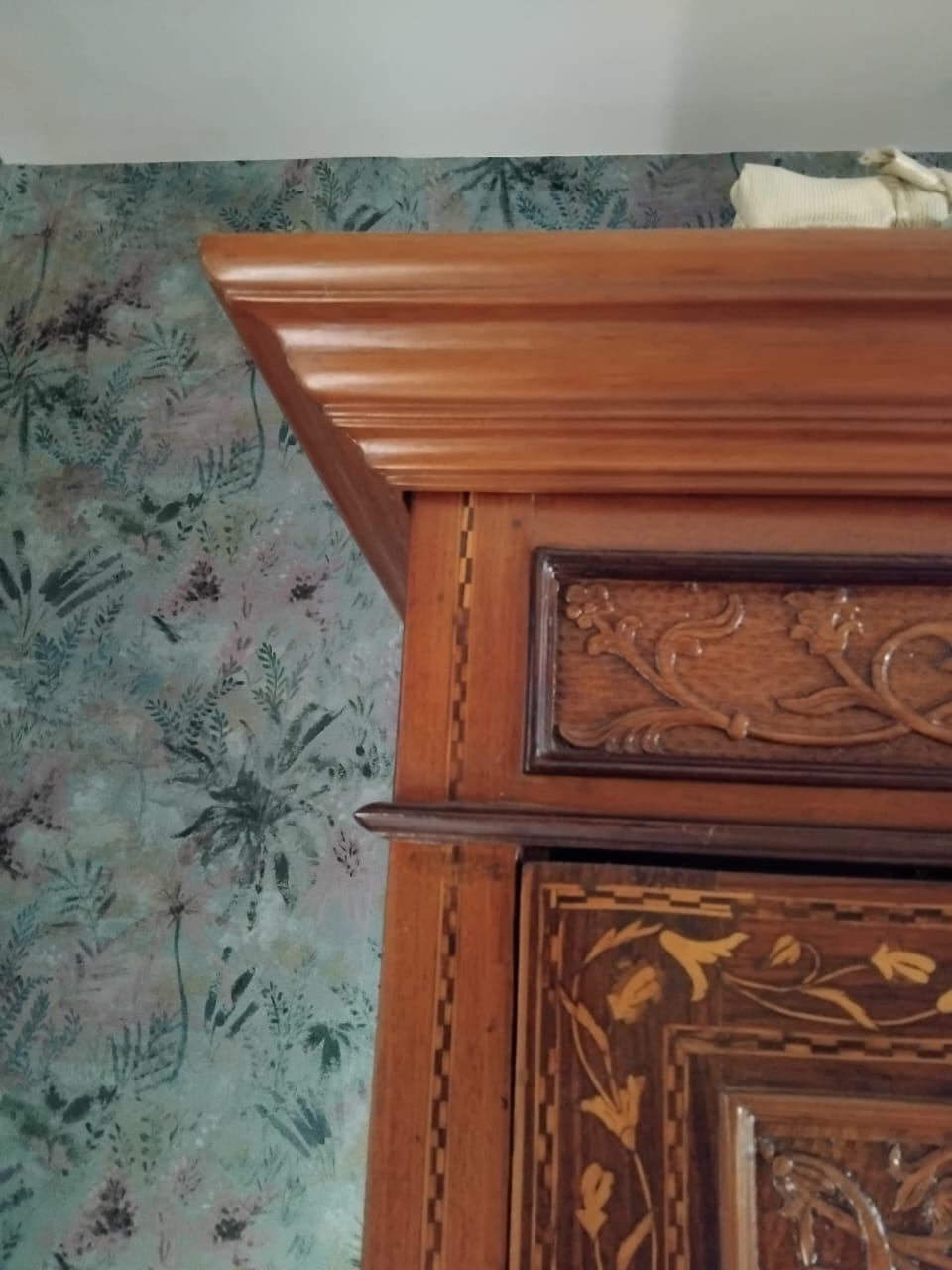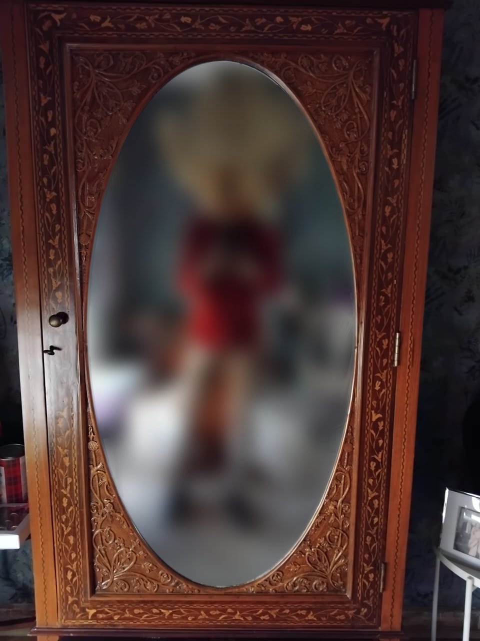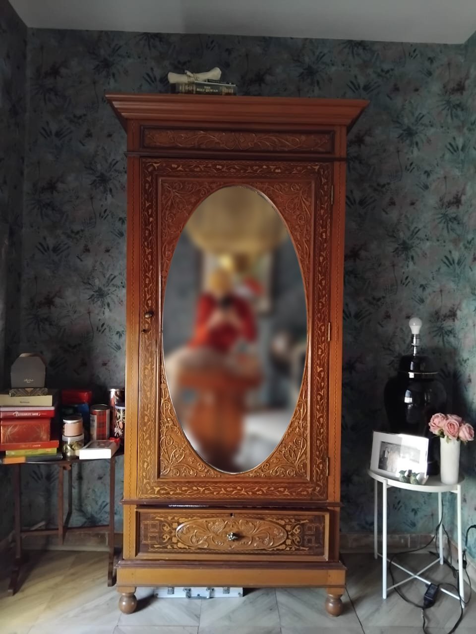 Embrace classic charm with this vintage wardrobe crafted from Sheesham featuring beautiful carved and inlay detailing throughout and a gracefully shaped beveled oval mirror, this armoire exudes old-world sophistication.
