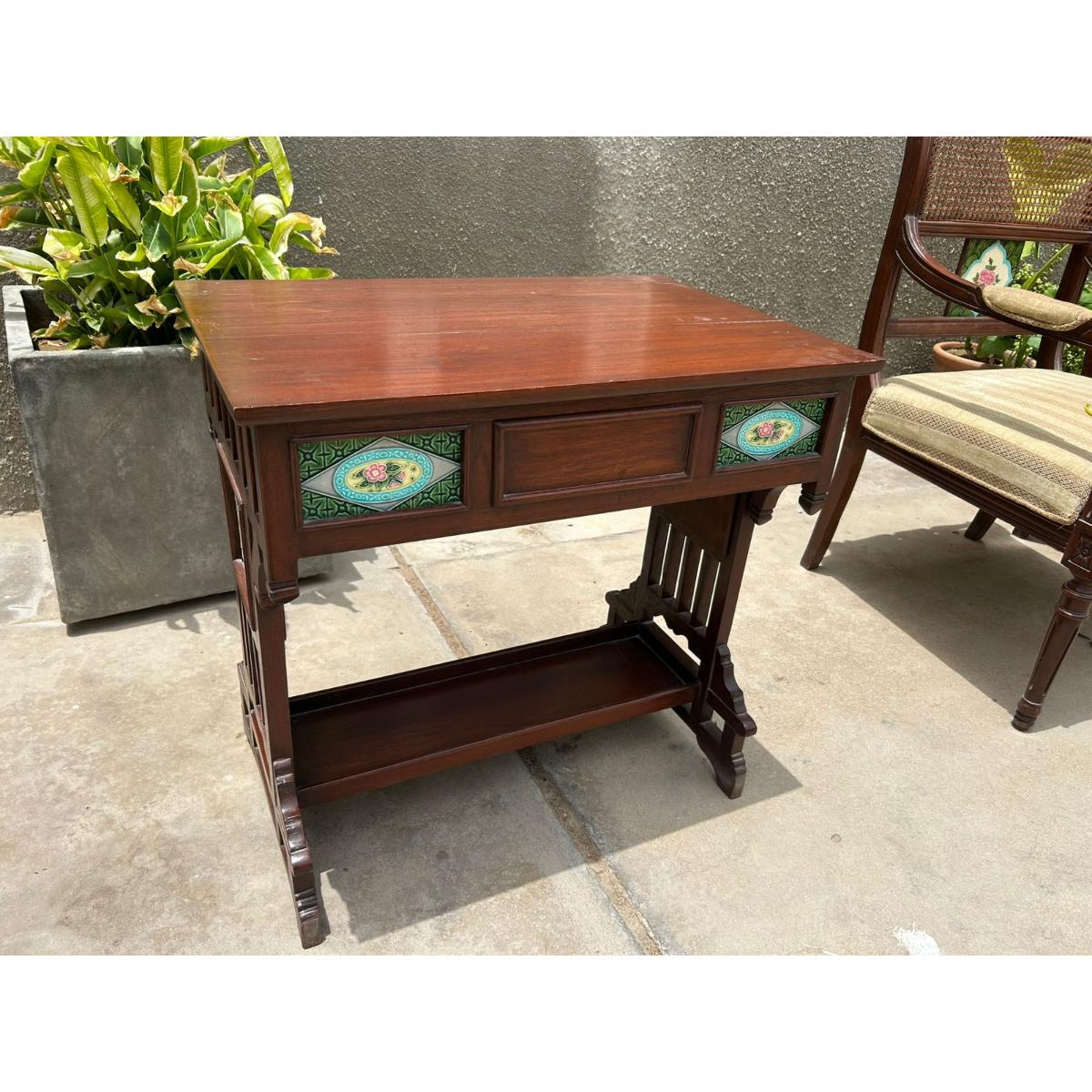 This elegant vintage side table is a stunning piece of traditional craftsmanship, made from solid Sheesham wood and adorned with vibrant hand-painted ceramic tile inlays.