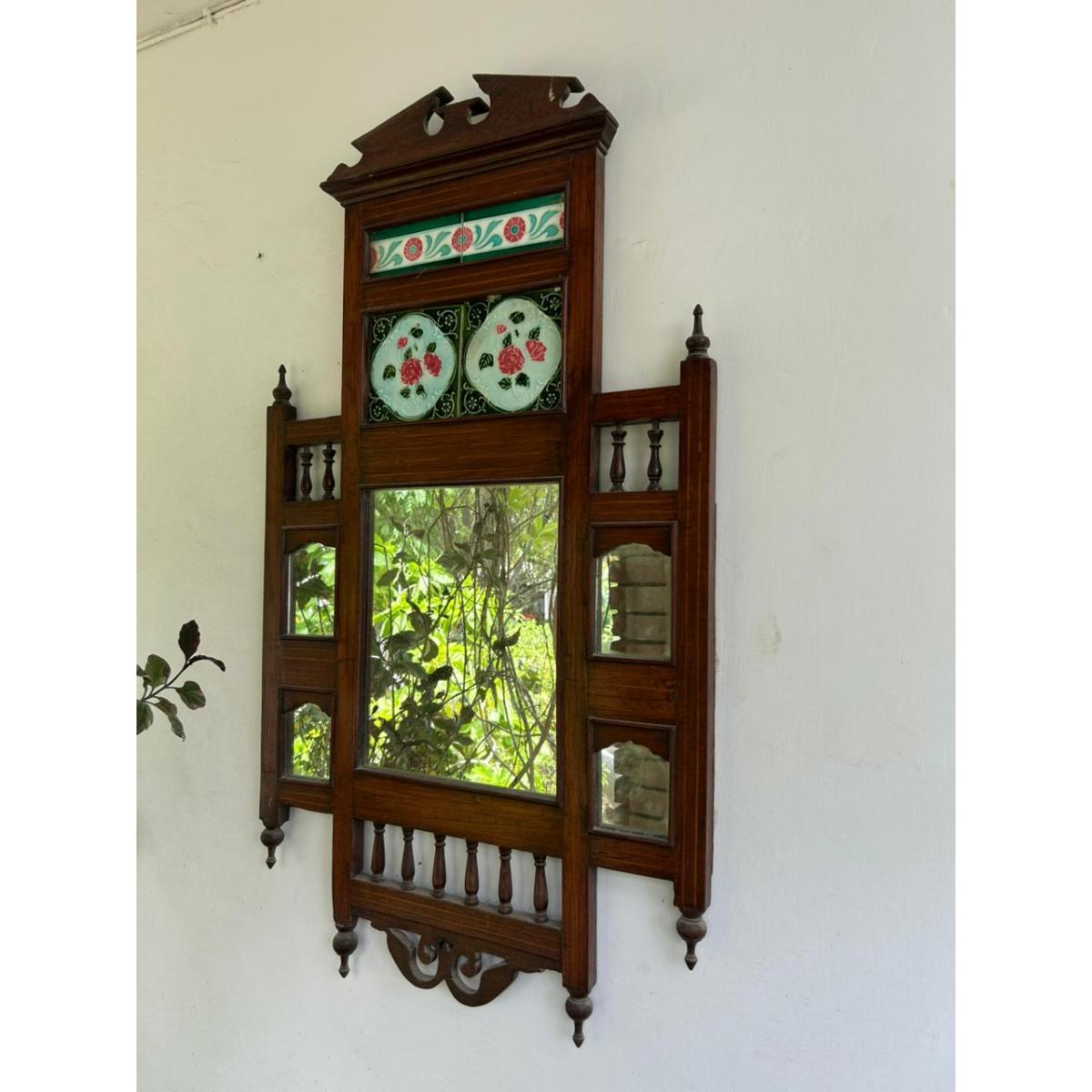 This unique wall-mounted vintage mirror frame is crafted from solid Sheesham and features a striking combination of hand-painted floral tiles and multiple mirror panels. Perfect accent piece for hallways, living rooms, or entryways.