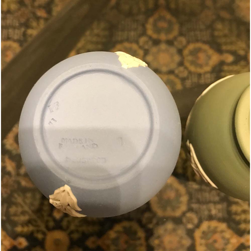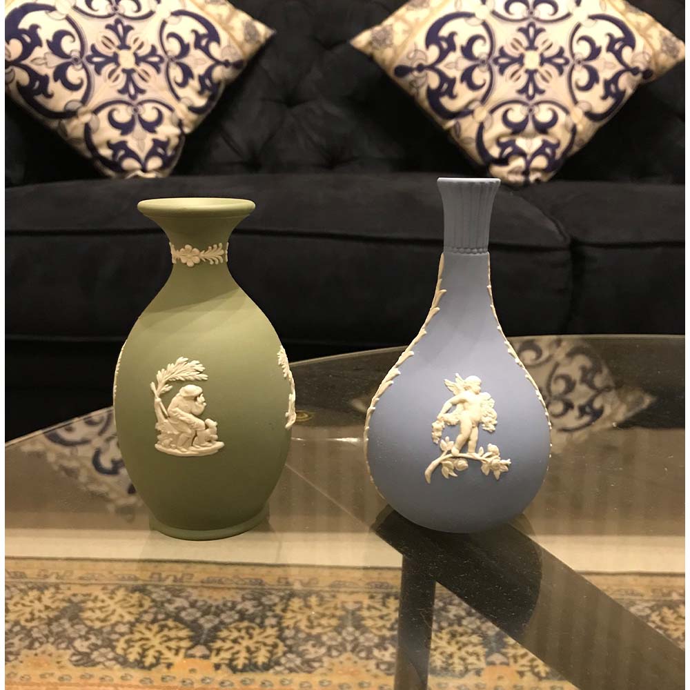 Small size vintage 1960’s Wedgwood sage green and blue jasper ware vases, made in England.