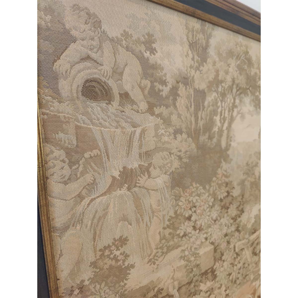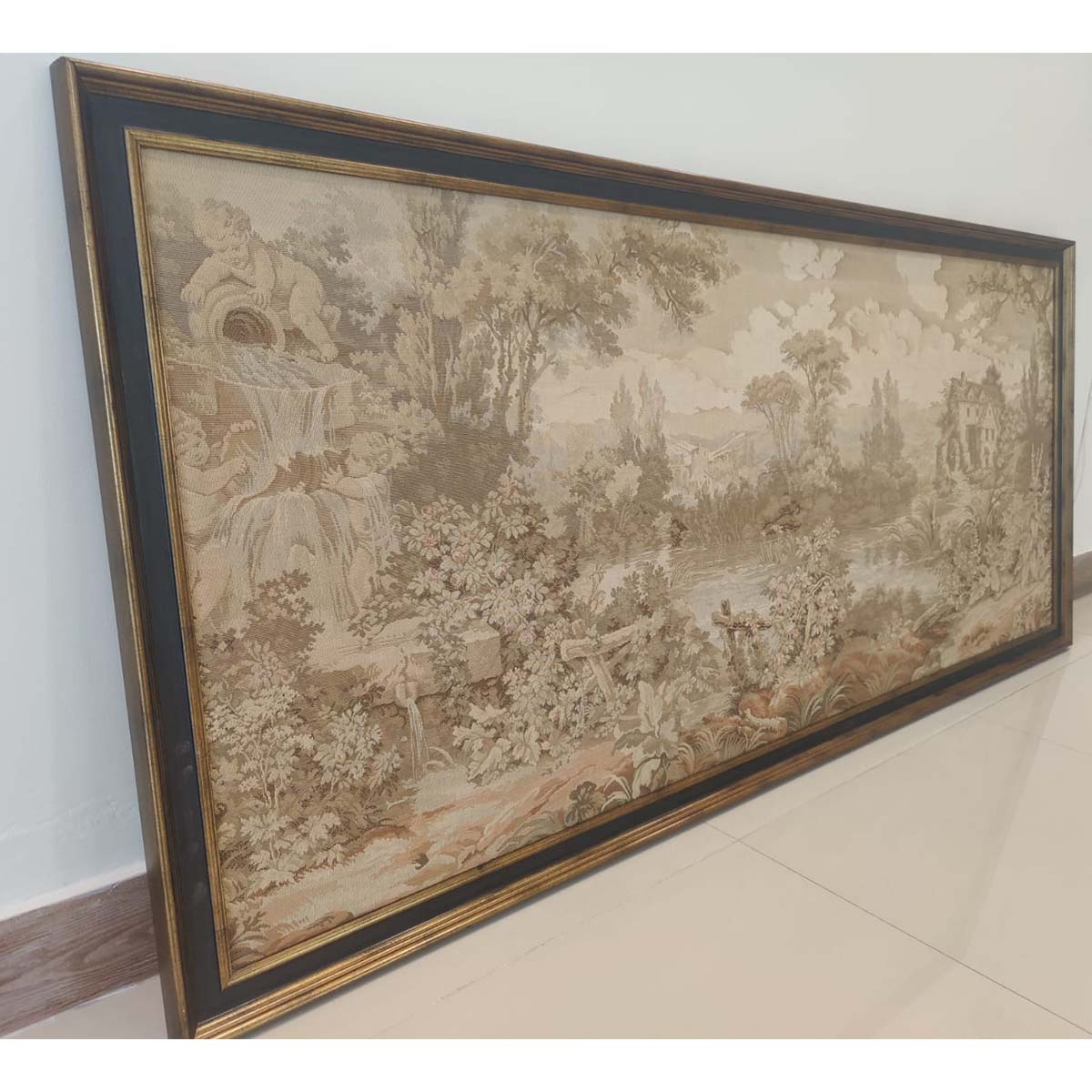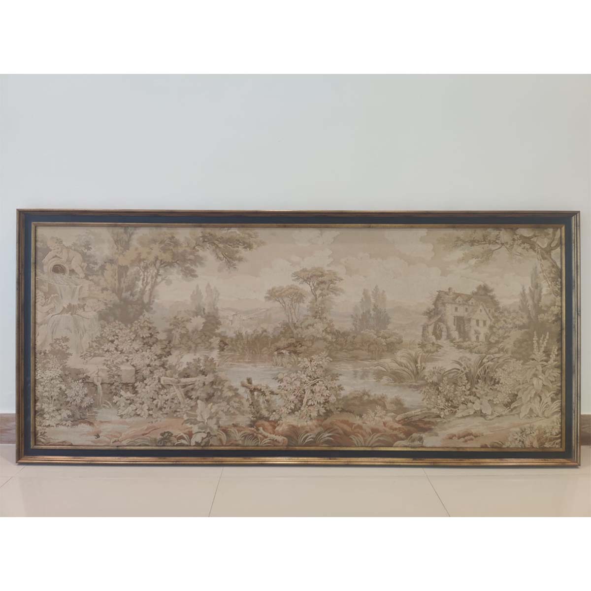Framed wall hanging tapestry in muted colors of a countryside woven.